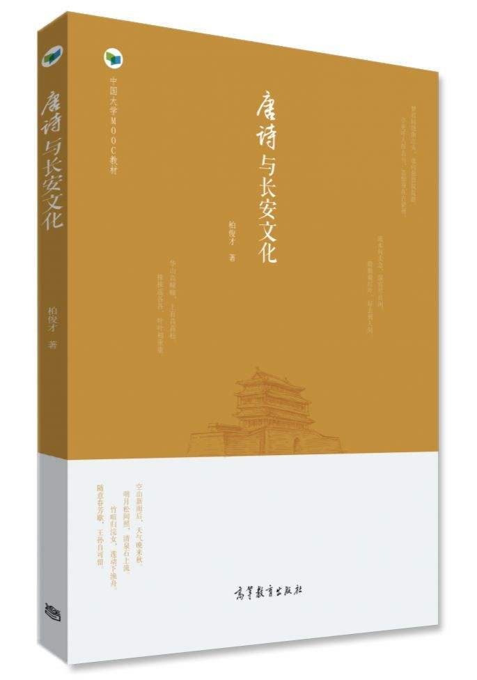 本书是同名慕课的配套教材。唐诗是中国古代诗歌的巅峰,也是中华民族最为灿烂的文化瑰宝。据统计,《全唐诗》、《全唐诗补编》中“长安”一词出现过一千四百余次,如果再加上“帝城”、“帝京”、“帝乡”“帝王州”、“皇都”、“九城”、“凤城”“上国”、“上京”、“京华”、“咸阳”、“咸京”、“秦京”等代称,以及长安城内道观、寺庙、风景名胜等,诗歌数量会更巨大。这门课程由这些有关唐代长安诗歌解读入手,分为爱情文化、政治文化、佛教文化、道教文化、科举文化、女性文化、酒文化、民俗文化、风景名胜、西域文化十个专题,让人们领略唐代长安文化辉煌灿烂的艺术魅力,增进文化自信,增强民族自豪感。该课程2018年5月起在中国大学MOOC网、智慧树等平台运行,同时该课程获批9428cn太阳集团古天乐“课程思政”示范课建设项目(2019年)、9428cn太阳集团古天乐校级一流本科课程建设项目(2020年)、陕西省精品在线开放课程(2019年)。