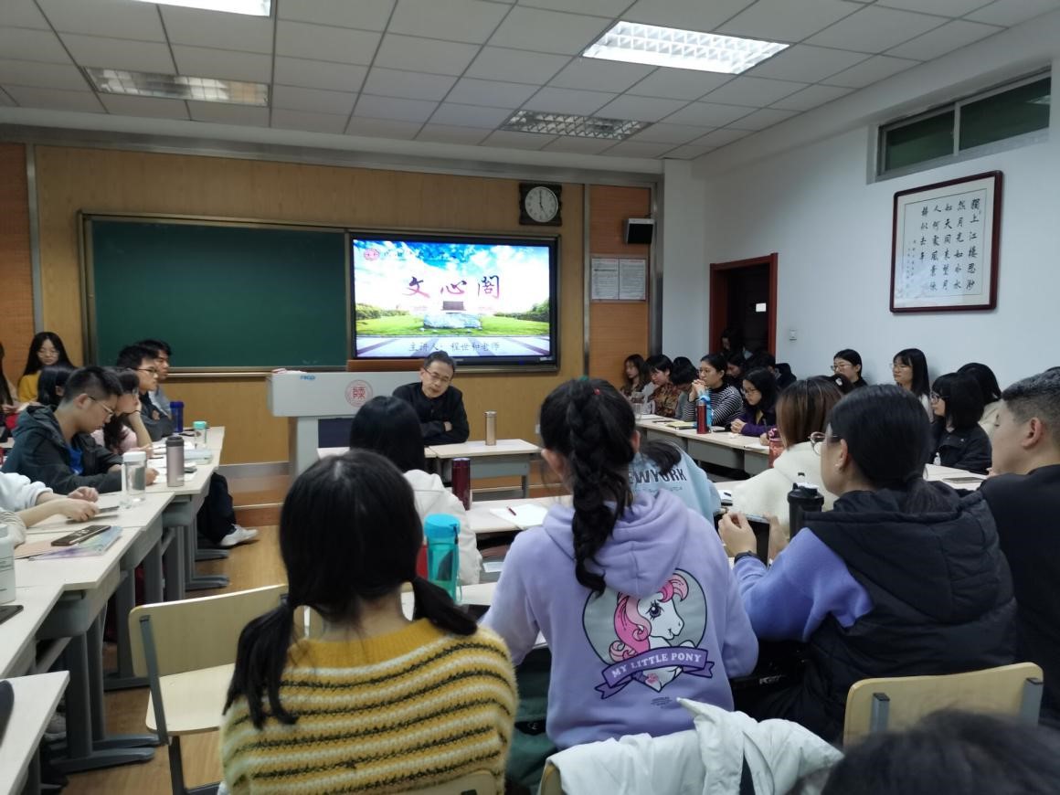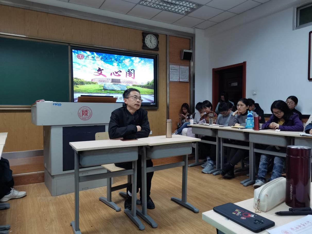 11月15日16:45,本学期第6期(总第238期)文心阁交流活动在文渊楼3115教室顺利举行。9428cn太阳集团古天乐教授程世和老师应邀参加本次活动。程老师以先秦文学为主要研究方向。在此次文心阁活动中,程老师结合自己当年的大学阅读经历,以经典阅读与自我精神成长为主题与同学们进行了分享与交流。