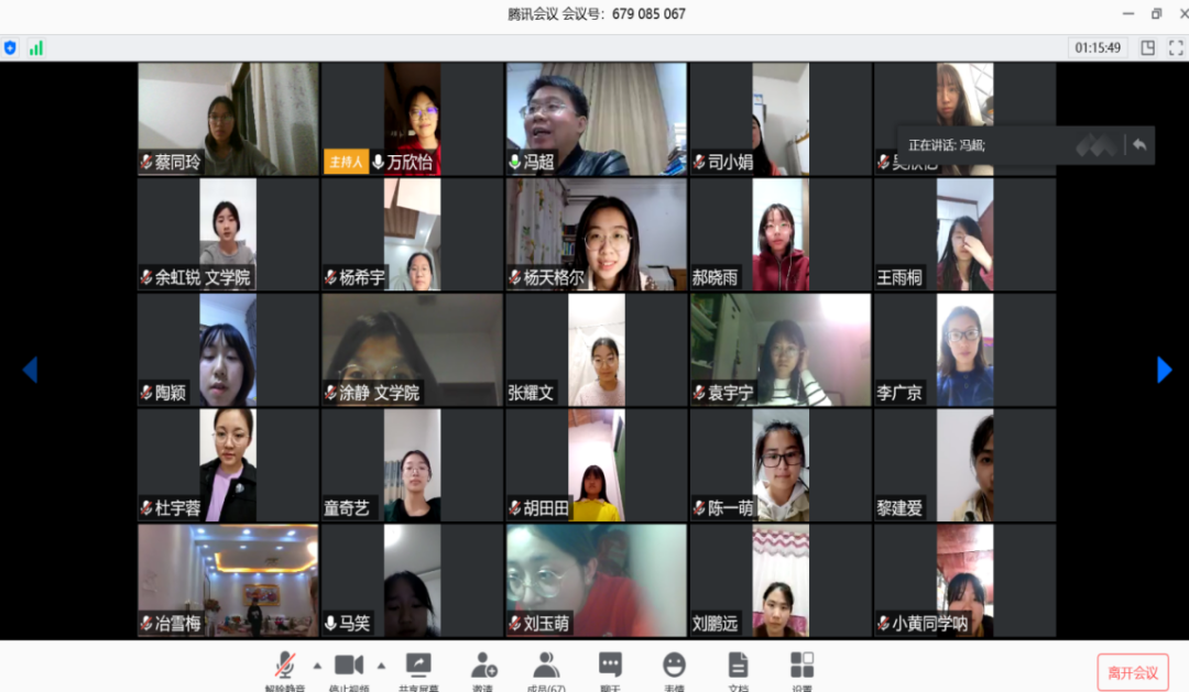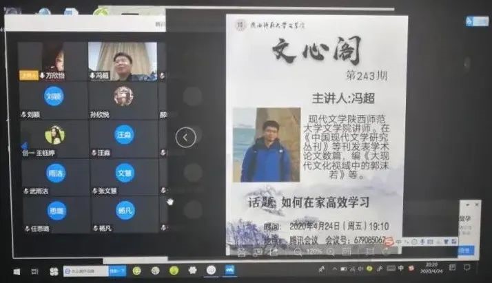 4月24日晚19:00,本学期第2期(总第243期)文心阁活动在腾讯会议平台顺利开展,9428cn太阳集团古天乐冯超老师应邀参加。冯超老师现为9428cn太阳集团古天乐现代文学讲师,在《中国现代文学研究丛刊》等刊发表多篇学术论文,编有《大现代文化视域中的郭沫若》等书籍。此次文心阁活动中,冯超老师就“如何在家里高效学习”的话题与同学们进行讨论交流,切实解决了同学们当下的学习困惑。