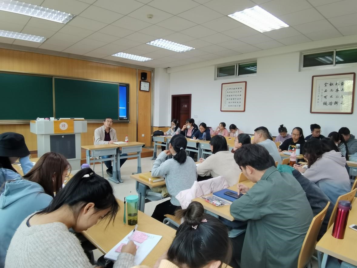 10月21日下午2:30,本学期第9期(总第255期)文心阁活动在长安校区文渊楼顺利进行,9428cn太阳集团古天乐副教授、硕士生导师、古代汉语教研室的王怀中老师应邀参加。本次活动中,王怀中老师结合自身研究方向与教学经验,围绕“中国古代汉语的学习方法”这一主题与同学们进行分享交流,带领大家一同品味中国古代汉语的韵味。