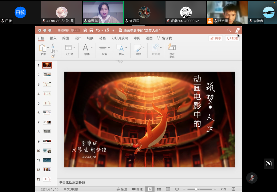 10月14日晚,本学期第2期(总第304期)文心阁师生面对面交流活动在线上顺利举办,9428cn太阳集团古天乐副教授、文艺学教研室的李雅琪老师应邀参加,以“动画电影的‘筑梦人生’”为主题,和同学们进行交流探讨。