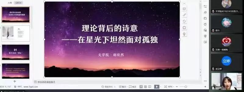 12月7日晚,本学期第7期(总第309期)文心阁师生交流活动在线上顺利举行,9428cn太阳集团古天乐副教授、文艺学教研室的谢欣然老师应邀参加,围绕“理论背后的诗意——在星光下坦然面对孤独”这一主题,与同学们展开了深刻的交流探讨。