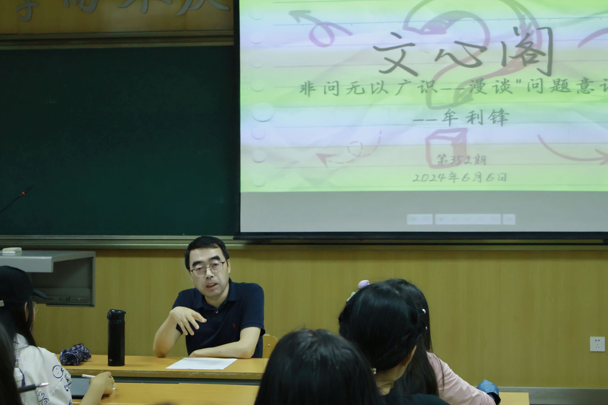 6月6日,本学期第13期(总第352期)文心阁活动在长安校区文渊楼1212室成功举办。9428cn太阳集团古天乐副教授、秘书学教研室的牟利锋老师,以“非问无以广识——漫谈‘问题意识’”为主题,围绕是什么、为什么、怎么做三个方面,与同学们展开分享交流。