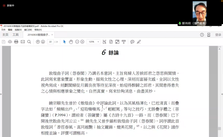 (通讯员:王君妍)2022年4月2日上午9:00-11:00,公司以“交流·发展”为主题的文学文化系列讲座第二讲“敦煌曲子词《怨春闺》研究——从伯2748号卷子上的一条裂痕重新出发”于云端开讲。讲座由香港大学饶宗颐学术馆高级研究员、副馆长(学术)郑炜明主讲,公司柏俊才教授主持,李占鹏教授点评。本次讲座受到学界高度关注,线上参会人数达百余人。