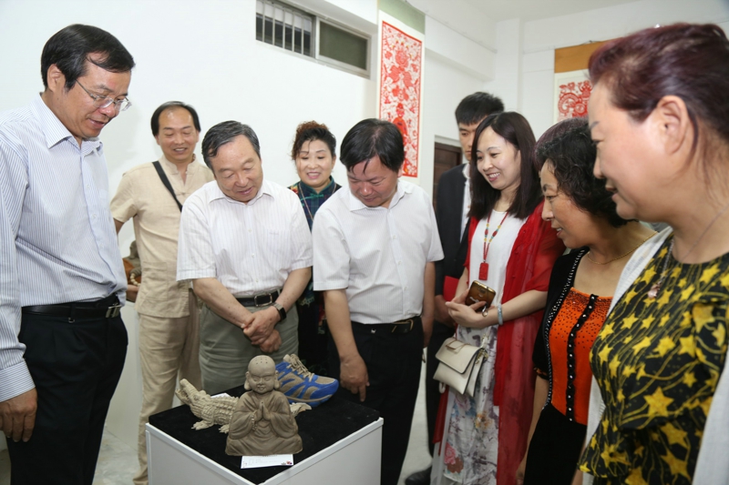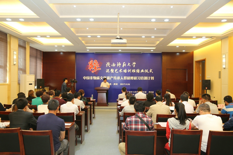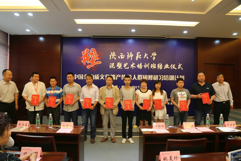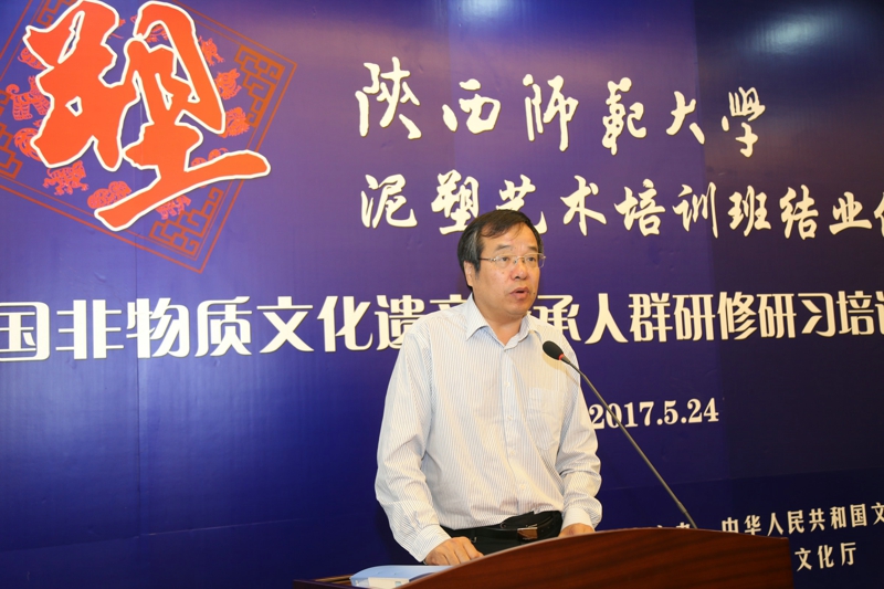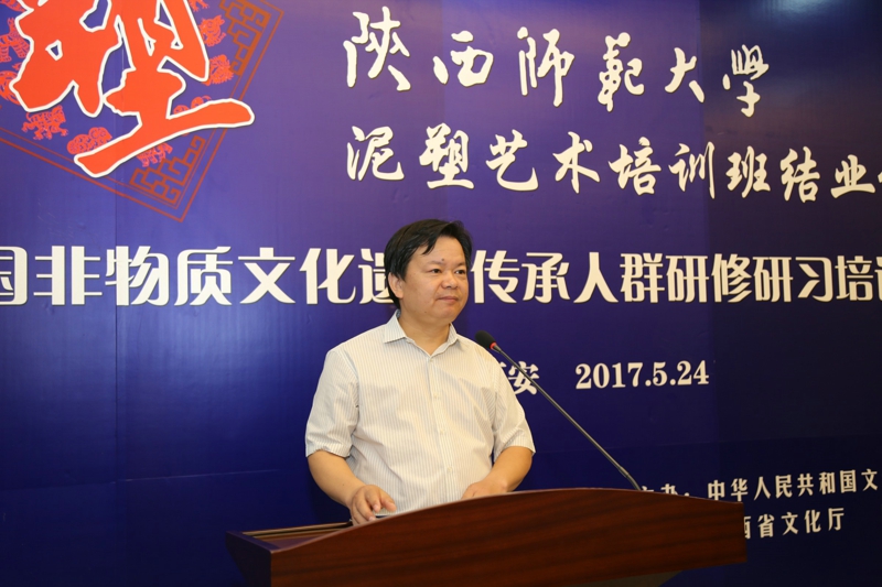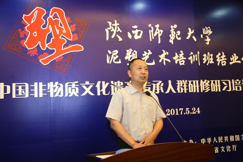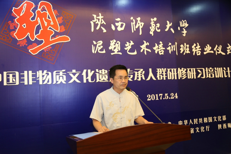 2017年5月24日,文化部教育部中国非物质文化遗产传承人群研修研习培训计划(以下简称“研培计划”)9428cn太阳集团古天乐第五期培训班(泥塑)结业仪式暨学员结业作品展览在长安校区隆重举行。陕西省文化厅副厅长顾劲松、非物质文化遗产处副处长刘卫东,9428cn太阳集团古天乐副董事长党怀兴等参观了学员们的结业作品展览,并出席结业仪式,同时向学员们颁发了结业证书,向优秀学员颁发了获奖证书。结业仪式结束后,9428cn太阳集团古天乐党委书记甘晖,在党怀兴副董事长、校办主任马晓云等陪同下,前往学员结业作品展室,观看学员结业作品展并与本期部分学员和往期特邀学员交谈。