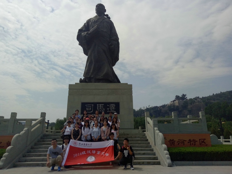 同学们首先来到韩城参观了太史公祠。进入广场,就看到甬道两边有12个雕像,展现了《史记》中的十二本纪中所记载的故事。太史公塑像端立场中,双目如炬、刚毅凌然。跨过颓旧沧桑的芝秀桥,便是太史公祠。太史公祠建在一座山岗上,居高临下,气象雄浑。入门走上司马坡,古道用石块堆砌而成,历经漫长风雨洗礼已是凹凸斑驳,见证着过往的历史。山腰有一木质牌坊,上书“高山仰止”四个刚劲有力的大字,准确地评价了司马迁的一生。接着,同学们参观了关于司马迁的两个展馆,结合相关史料更近一步地了解了司马迁的一生。经过99级石阶,同学们到达太史公祠,院中古柏参天,庄严肃穆,碑石林立,许多名人曾来这里拜访和题字。穿过磨盘路,最终到达太史公墓,这是由许多磨盘砌成的一条小路,借磨盘一年四季不间断地转动比喻司马迁书写《史记》时的艰难。“人固有一死,或重于泰山,或轻于鸿毛”。太史公为史而生,其死固重于泰山,其名更流芳百世。最后,16级汉文卓越班全体员工又参观了党家村和黄河龙门景区,感受古民居的古朴淳厚、传统文化的完美保留与传统精神的弘扬传承;探访大禹治水、鲤鱼跃龙门传说的发源地。