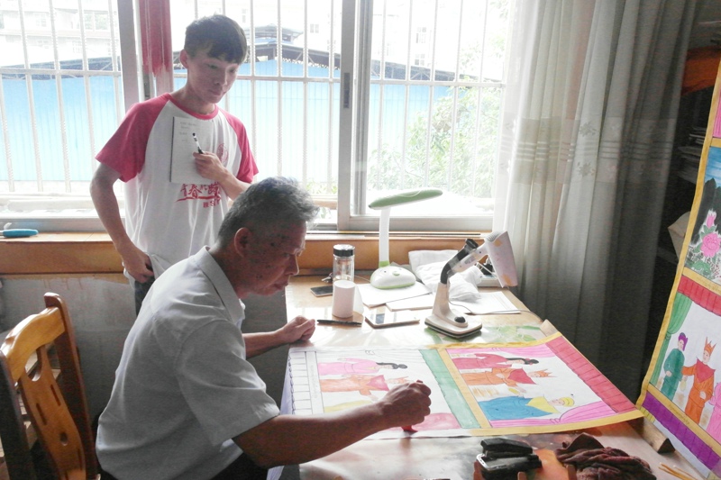 稍后,实践团成员拜访了景谷县傣文化协会会长周继元。周老先生向我们展示了傣族传统绘画特色。傣族绘画多依托于佛寺所用的经幡,绘画内容多为佛教及傣族民间各种故事。这些故事多歌颂真善美,劝导人向善奉献,在当地发挥着重要的教化作用。周老先生还向大家介绍了傣文化协会目前所做的一些傣族传统文化保护工作以及工作中所遇到的困难。实践团成员认真倾听并做了记录。最后,周老先生向实践团成员赠送了由他主编的《傣族民间故事》。