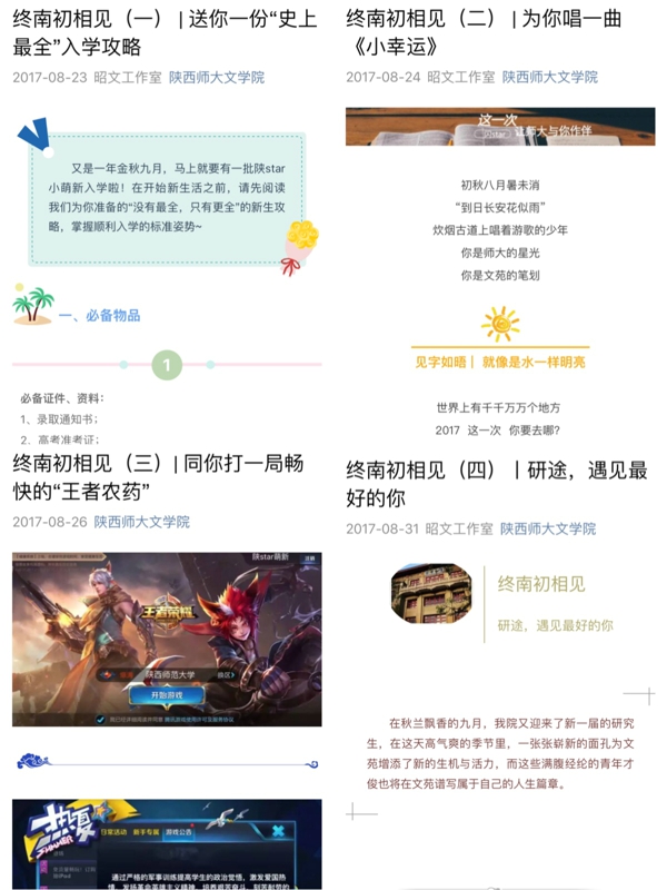 从正式录取开始,公司做好联系地址确认、通知书寄送、迎新材料准备、志愿者招募等一系列迎新组织、策划、筹备工作。上学期期末,研究生辅导员组织院研究生会召开研究生迎新工作安排会,讨论并制定迎新方案。暑假,建立“9428cn太阳集团古天乐17级研究生之家”新生QQ群,以便同学们有问题可以随时提问并得到及时解答。8月底,迎新志愿者提前返校,轮流值班,为来校新生提供咨询和帮助,更好地解决新生入学遇到的问题。在新生网上自主选宿舍前,志愿者为每位同学发送温馨短信,告知并强调选宿舍事项,以保证每位同学都能成功在网上选到满意宿舍。报到前夕,昭文工作室在公司微信公众平台推出“走进文苑”介绍系列六篇、“终南初相见”迎新系列四篇,帮助新生全面了解公司,熟悉报到流程及校园环境;官微还推出公司员工原创歌词、演唱的歌曲《小幸运》,受到广泛关注。
