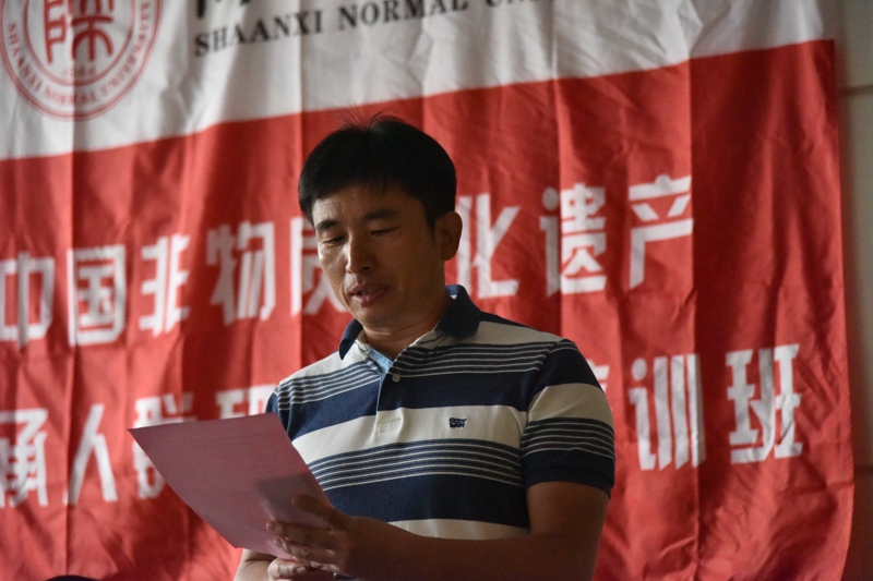 来自咸阳市三原县的姜攀身为咸阳市非物质文化遗产项目三原面花制作技艺代表性传承人,代表本期学员在开班仪式上发言,他以自己的从艺经历为例,介绍了自己在传承非遗文化方面的艰辛和喜悦,号召大家在创作中不断突破自我,做一个优秀的非遗人。