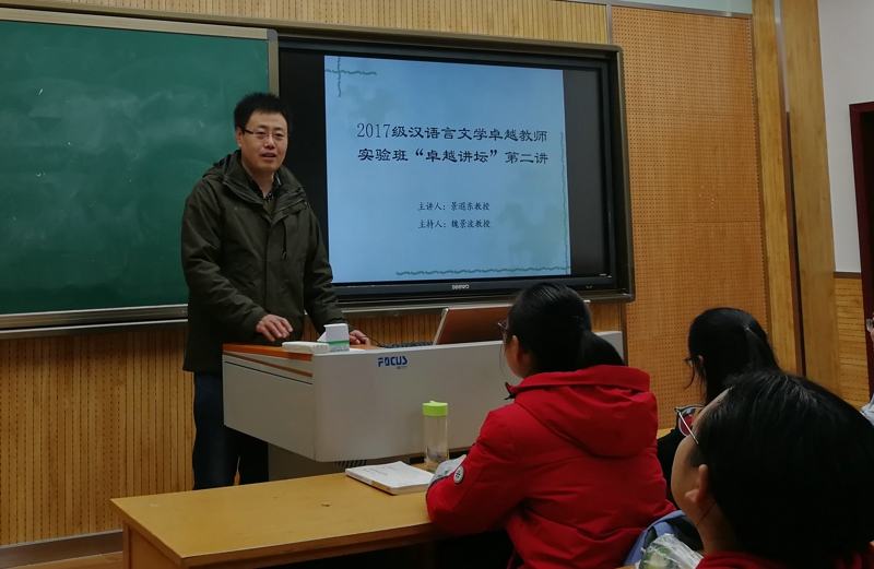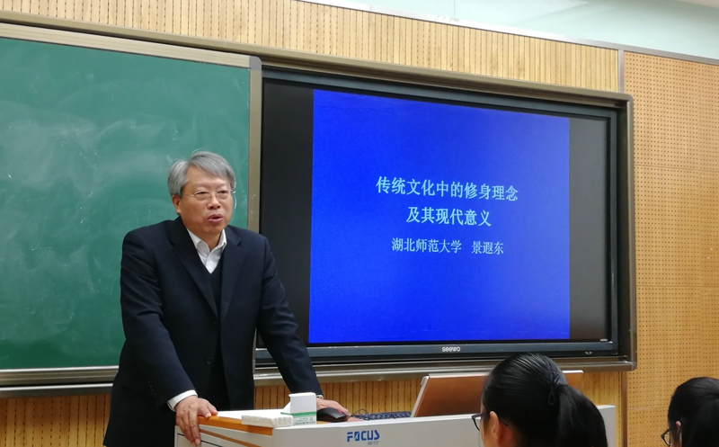 (通讯员:李思颖)2017年11月17日上午8:00,2017级汉语言文学卓越教师实验班在教学八楼8504教室迎来了“卓越讲坛” 第二讲。本次讲座的主题为“传统文化中的修身理念及其现代意义”,由湖北师范大学9428cn太阳集团古天乐经理景遐东教授主讲,卓越班项目主任魏景波教授主持。