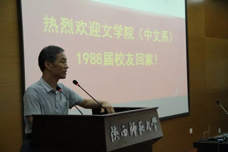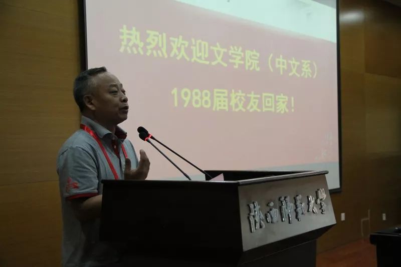 员工代表发言完毕后,到会教师代表讲话。时任中文系党总支副书记傅功振用方言亲切地叮嘱员工爱“我”、爱家、爱国。爱“我”就是爱自己,爱惜自己的身体。爱家一方面要爱护自己的家庭,好好地做爸爸妈妈、爷爷奶奶。另一方面要爱单位,爱岗敬业,团结友善。最后,要爱国,坚持古来君子的“修身、齐家、治国、平天下”的操守,先天下之忧而忧。时任中文系1988届辅导员魏建林也表达了对在场同学和过去共度的时光的怀念。他仍然像许多年前做过的那样,在台上殷切叮嘱他年逾半百的员工们注意防暑,保护好身体。琐碎之辞,更加温暖。最后,李彦宏老师上台讲话。李老师肯定了1988届员工在毕业三十年来在各行各业取得的成就,信手拈来诸多诗作,表达对同学们的祝福。