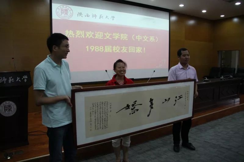 发言完毕后,报告厅响起了久久不息的掌声,气氛欢欣热烈。在这样的气氛中,中文系1988届毕业生向公司和老师赠送纪念品。