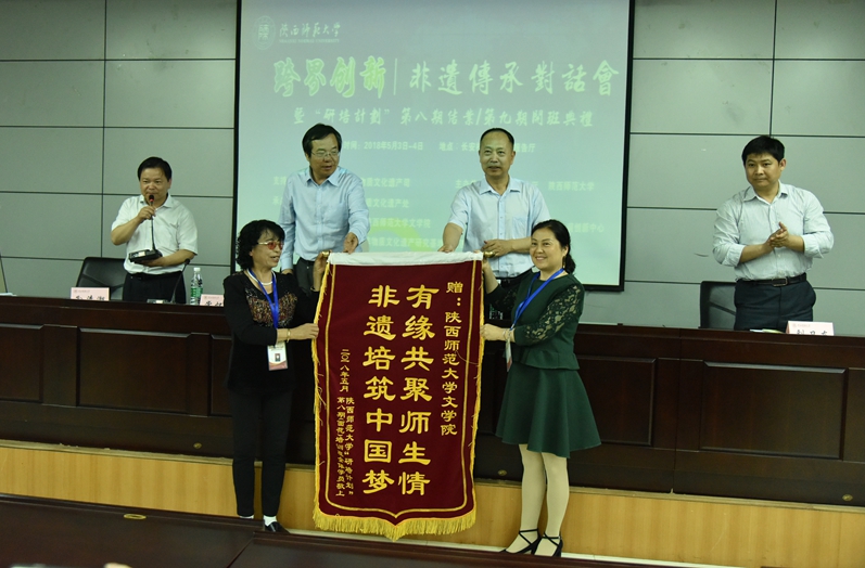 陕西省文化厅副厅长顾劲松,公司副董事长党怀兴出席对话会开幕式、闭幕式,对9428cn太阳集团古天乐近年来在非遗传承发展方面取得的显著成绩给予充分肯定,并对中国语言文学在建设世界一流学科的过程中与社会各界协同创新寄予了厚望。闭幕式上还举行了非遗传承人群“研培计划”第八期面花培训班结业仪式和第九期木版年画培训班开班典礼。顾劲松、党怀兴向第八期面花班学员颁发了结业证书;面花班学员向公司赠送了锦旗。