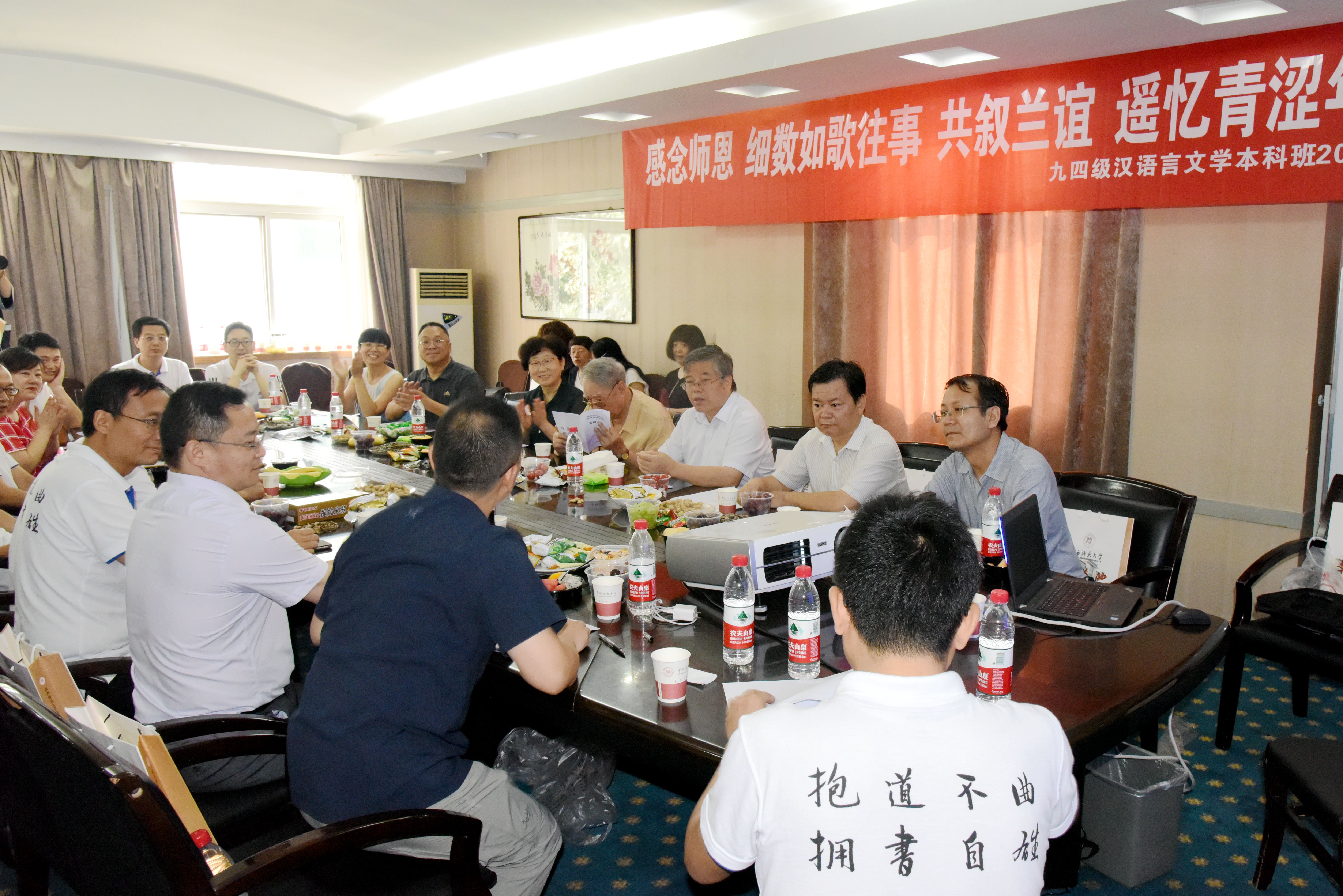 老师们与员工们共同回忆了那些年那些事,87岁高龄的傅正乾教授语重心长,既是恩师又是慈父;陈枫教授希望员工们与书相伴,积淀更深厚的人生;田刚教授讲到动情处,声情并茂地朗诵了诗人杜甫的《赠卫八处士》,把座谈会的气氛推向了高潮。辅导员马正平深情回顾了与员工们朝夕相处的一幕幕往事,一起经历的难忘瞬间,期待着大家创造更多的人生精彩。座谈会上,员工们用饱含着刻骨铭心爱的致辞,和为此次聚首创作的诗歌朗诵《致师大》,表达了对曾经培育四年的母校、历任教师、辅导员刻骨铭心的爱和最崇高的敬意、最真挚的祝福。
