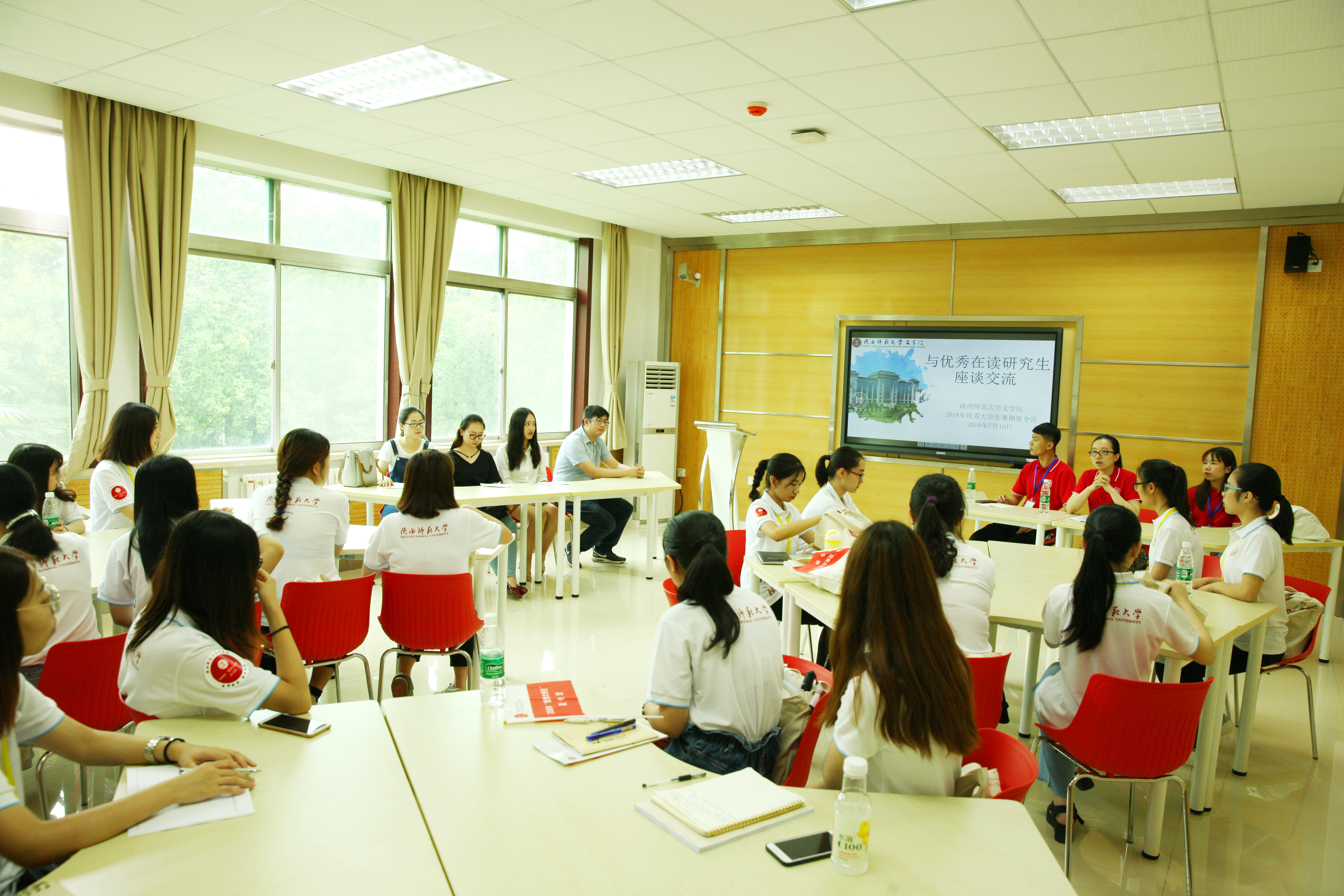 四位在读研究生讲述了自己在陕师大生活和学习的感受和体会。2016级古代文学专业的刘悦同学介绍了9428cn太阳集团古天乐的整体学术氛围和学术风气; 2017级古代文学专业的王旭文和现当代文学专业的黄一晨分别介绍了自己本专业的研究特色和学科魅力;从本科至研究生在9428cn太阳集团古天乐度过了六年的董敏同学从后勤生活、员工活动等方面分享了自己的经历和感受。