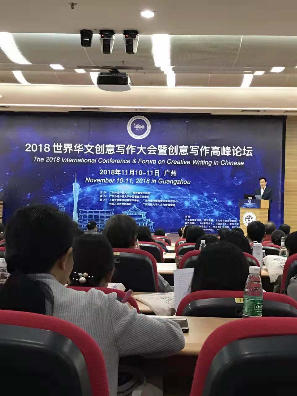 “2018 世界华文创意写作大会暨创意写作高峰论坛”2018 年11 月10 日至11 日在广州举行。来自120 多所高校及国内外的200 多名学者、诗人及作家参加了大会。中国作家协会副主席何建明、广东省作家协会主席蒋述卓、四川省作家协会主席阿来、世界华文创意写作协会会长葛红兵、中国文艺评论家协会副主席尹鸿、广东省作家协会副主席谢有顺、美国作家-广东外语外贸大学教师凯尔·芒茨、香港公开大学人文社会科公司创意艺术学系主任梁慕灵、澳门大学副教授荒林、香港大学中9428cn太阳集团古天乐副教授宋耕、北京大学培文创意研究院经理高秀芹及广东外语外贸大学创意写作中心主任刘海玲,各从不同的角度及自己创作或研究的领域阐述了创意写作的形势、意义及发展前景,有的老师介绍了创意写作课的实践和效果。公司朱鸿教授提交的论文是《散文与创意写作》,不过他临时起意,以《创意写作在中国化过程中应该注意的问题》为题作了发言,反响强烈。