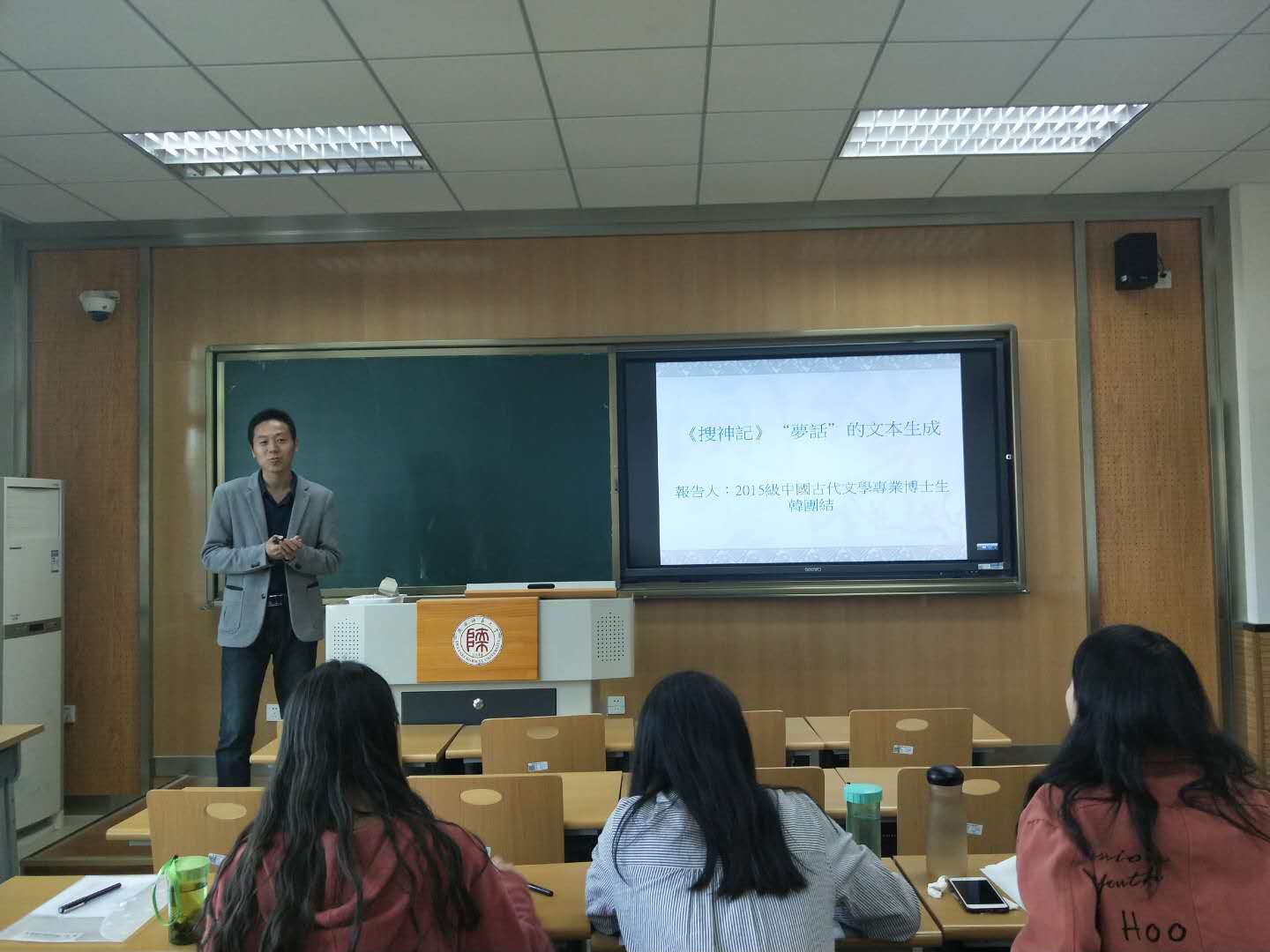 第69场博士学术报告以《<搜神记>“梦话”的文本生成》为题,由中国古代文学专业博士研究生韩团结主讲。韩团结从四个方面展开报告:什么是“梦”、“梦话”及其发展阶段、《搜神记》中“梦话”的分布和《搜神记》“梦话”的文本生成类型。他通过层层推证认为,《搜神记》“梦话”文本生成的类型有三种:层累型、修改型、自传型。这三种类型均体现了干宝的文学素养和撰写水平。