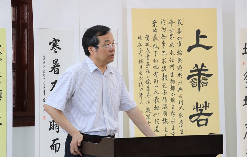 党怀兴在致辞中指出,公司离退休老教授坚持12年毛笔手写录取通知书已成为公司“以文化人”的标志性活动,本次书画展的举办也得到了校书画研究会各位离退休老教授的鼎力支持。党怀兴强调了书法学习的重要性,希望每一位师大学子都要认识到汉字书写和核心素养的内在关系,不仅要把字写好,更要多读经典涵养字外功夫。他借草书大家于右任先生先生“一天一个字,三年《千字文》”的故事激励大家坚持一生练字,砥砺自我,以实际行动传承祖国传统书法文化,并希望砚友书画社全体成员能承担起传承书法文化的重任,影响和吸纳更多热爱传统书法艺术的师生加入这个队伍,创造更加靓丽的师大书法风景。