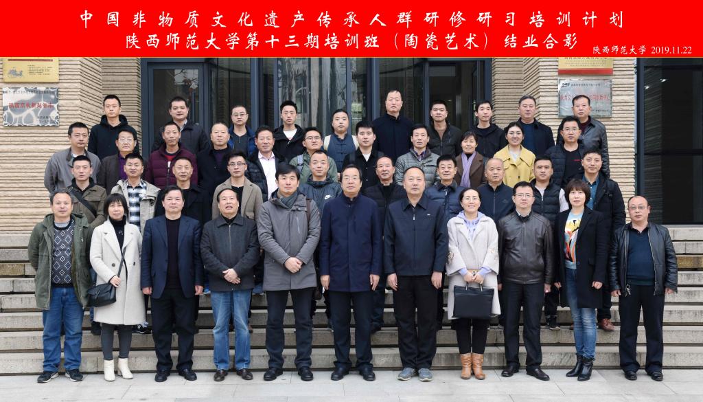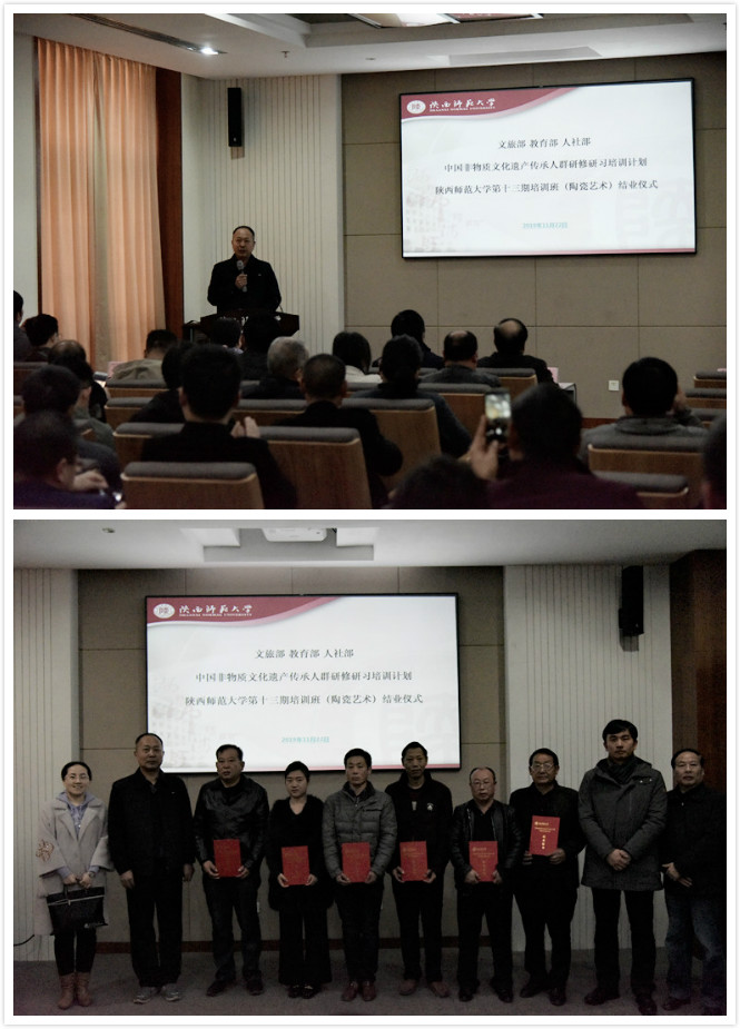 (通讯员 陈丹玉)2019年11月22日,文化和旅游部、教育部、人力资源和社会保障部中国非物质文化遗产传承人群研修研习培训计划(以下简称“研培计划”)9428cn太阳集团古天乐第十三期培训班(陶瓷艺术)结业仪式暨学员结业作品展览在长安校区隆重举行。陕西省文化和旅游厅副厅长顾劲松、非物质文化遗产处副调研员周颖,9428cn太阳集团古天乐副董事长党怀兴等出席结业仪式并参观了学员的结业作品展览,同时向学员们颁发了结业证书,向优秀学员颁发了荣誉证书,共同观看了9428cn太阳集团古天乐“研培计划”就业创业先进学员微视频。