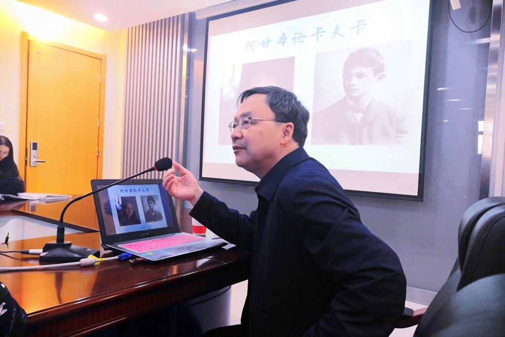 接下来他以阿甘本研究卡夫卡的文本及其翻译为材料,从证据源于一种语言分析、法律与“法之力”、生命转型成经文三个部分讲起,从“土地测量员K”的身份问题及其内涵和隐喻,进而延伸到语言学、法哲学、法政治学、宗教学等广阔的人文科学研究领域,让师生们了解了阿甘本对于卡夫卡的跨学科的研究视野,也感受到卡夫卡把文学作为祈祷方式的文学哲学观。