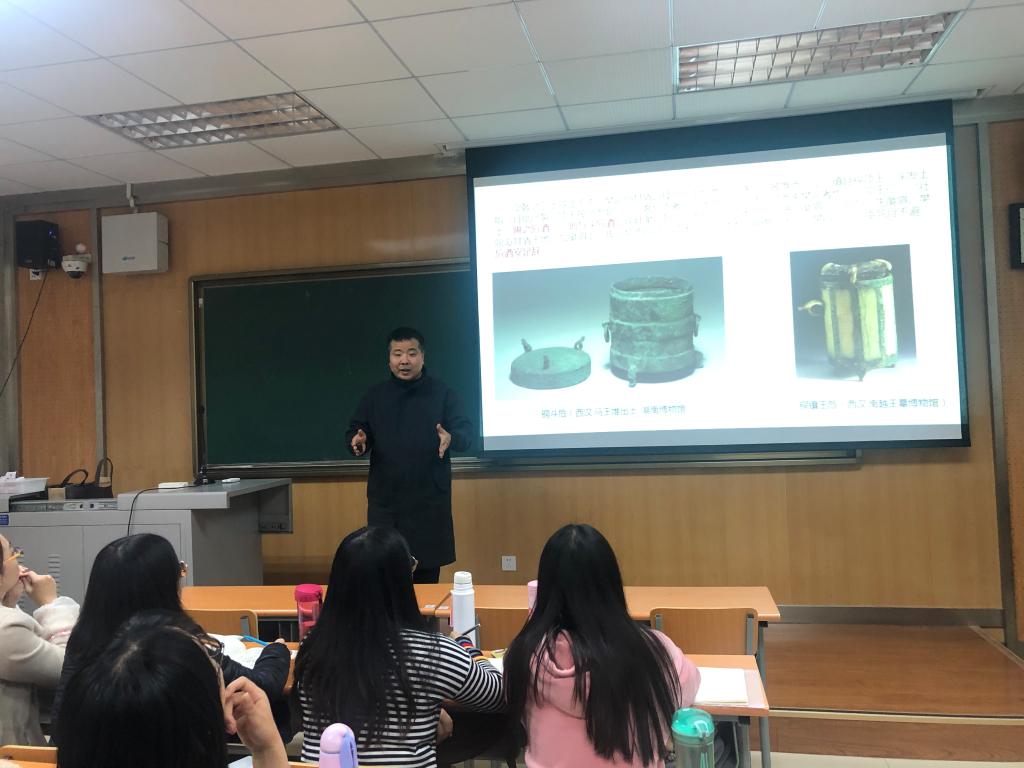 李老师选取了衣、食、住、行四个方面的典型文物,逐一进行了讲解。衣物方面,李老师介绍了衽、衿、深衣、裳、胫衣、冠冕等服饰。食物方面,李老师介绍了床、瓦缶、尊、鼎、羽殇、铜敦等用食工具。建筑方面,李老师介绍了三出阙、祚、萧墙、堂、室等古代居室的建筑组成部分。出行方面,李老师简单对古代的车辆进行了展示。李老师在介绍文物的同时,还列出了文学当中与之相关的作品。如对于杜甫的诗歌“剑外忽传收蓟北,初闻涕泪满衣裳”,李老师通过对衣和裳的介绍,让大家明白诗句的确切含义是诗人的眼泪将上衣和下裳都打湿了,揭示出诗人内心情感之深。李老师强调,文物是文化和文明的载体,弄清楚文物的内涵可以帮助我们对古代作品有更加深刻的理解。