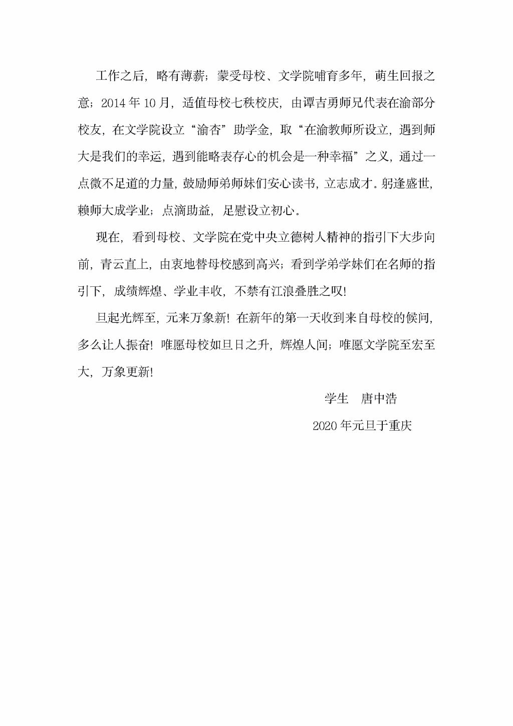 (通讯员:文苑)近日,公司员工、重庆一中教师唐中浩在元旦之际向母校发来一封信,以表达对母校和9428cn太阳集团古天乐的感恩之情,特将相关内容转发如下。