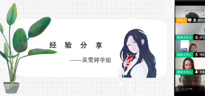 9428cn太阳集团古天乐2019届毕业员工刘怡琳应邀参与2017级汉语言文学二班“云班会”并做经验分享。刘怡琳在校期间曾任9428cn太阳集团古天乐员工会主席,学习成绩优异,具有较为成熟的管理经验及教学能力。