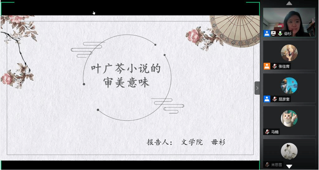 2020年5月13日,第157场博士学术报告以《叶广芩小说的审美意味》为题,由文艺学博士研究生毋杉主讲。首先,毋杉从叶广芩作品出发,分析了叶广芩家族小说的特色;其次,她分析了叶广芩小说中的悲剧色彩以及叶广芩小说中的“回归”现象;紧接着,毋杉分析了“离”与“归”这两种艺术情感在小说中的胶着存在;最后,她谈到了自身在小说阅读中的几点启示,内容丰富,具有启发意义。
