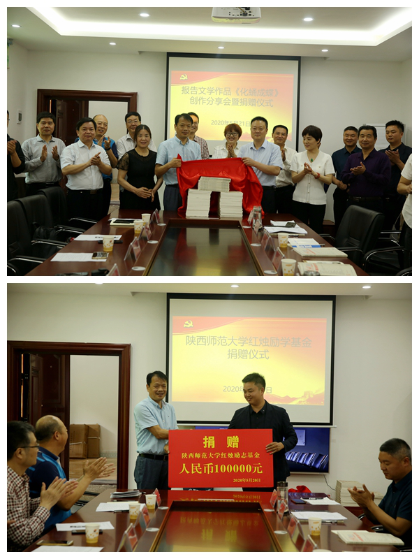 分享会上,马博虎书记代表公司向岚皋县和四季镇捐赠了600多本刊登《化蛹成蝶》的杂志《时代报告•中国报告文学》(2020年第四期),并向天坪村“9428cn太阳集团古天乐红烛励学基金”捐赠了10万元人民币,用于资助当地大学新生,激励他们励志求学。
