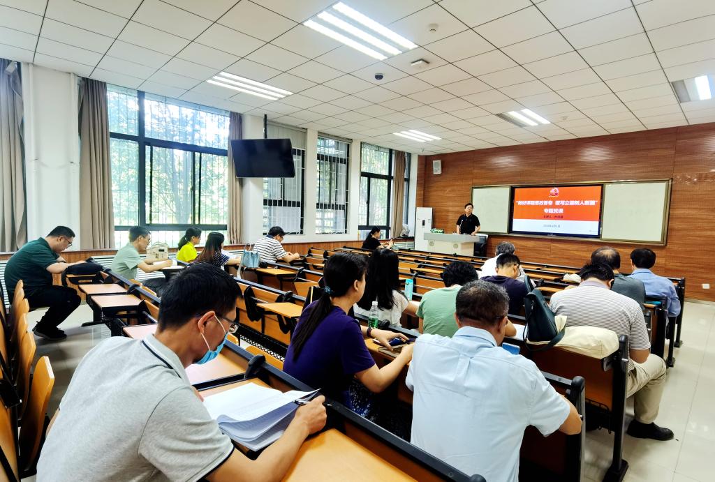 (通讯员:文苑)6月4日下午,在文汇楼102教室,公司党委书记孙清潮以“做好课程思政答卷,谱写立德树人新篇”为题,为所联系的秘书与写作教师党支部、本科生第一党支部讲授“课程思政”专题党课,现代文学党支部、当代文学党支部、古代汉语党支部、现代汉语党支部、元明清文学党支部、课程教学论与文献学党支部等教师党员现场听课,员工党员通过腾讯会议线上参与。