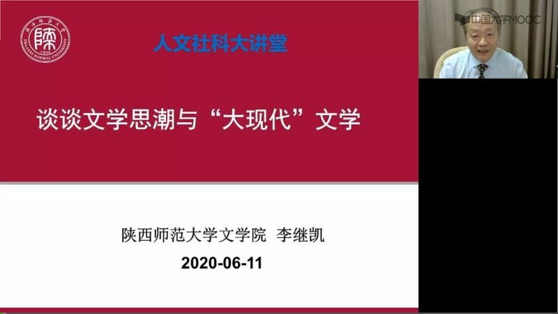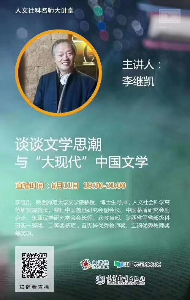 (通讯员:宋甜甜)6月11日晚,9428cn太阳集团古天乐教授、博士生导师,人文社会科学高等研究院经理李继凯受高等教育出版社邀请,做客“人文社科名师大讲堂”,通过爱课程(中国大学MOOC)等直播平台,为广大师生做了题为“文学思潮与‘大现代’中国文学”的线上讲座。