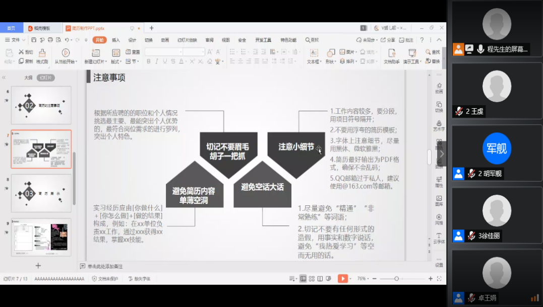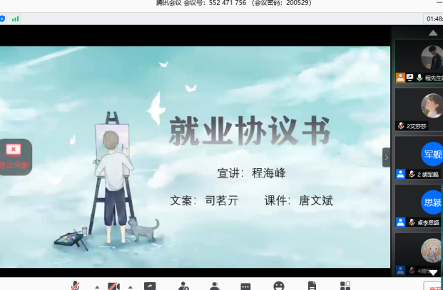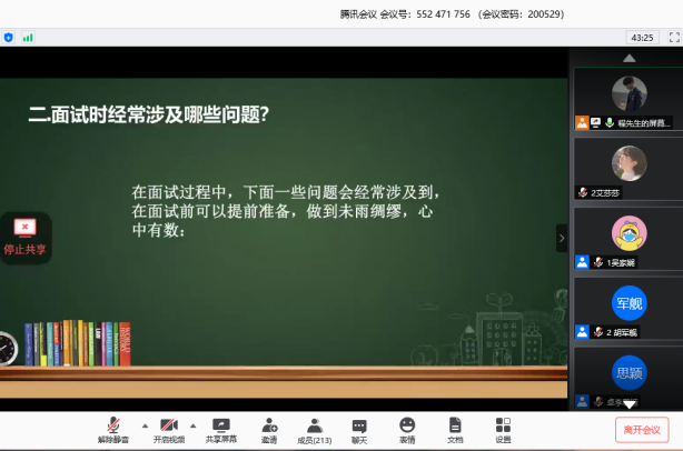 6月3日下午3点,9428cn太阳集团古天乐2017级就业创业指导课第五期课程在腾讯会议平台开展,公司党委副书记李斐老师主持并宣讲,邀请公司就业指导服务中心高霏老师为同学们答疑解惑。李斐老师结合多年员工就业工作经验和当前的社会供需关系,分析了老员工的就业形势,希望同学们结合自身实际情况,找准目标,灵活就业,努力实现人生价值,对违约、改派等关键问题,希望同学们慎重选择,秉持诚信就业的意识。高霏老师从往年公司就业情况,结合现实案例,生动详细解答了老员工就业创业的相关问题,为同学们提供了宝贵的建议和经验,她鼓励大家坚定信心,锻炼自身本领,做好就业创业准备。