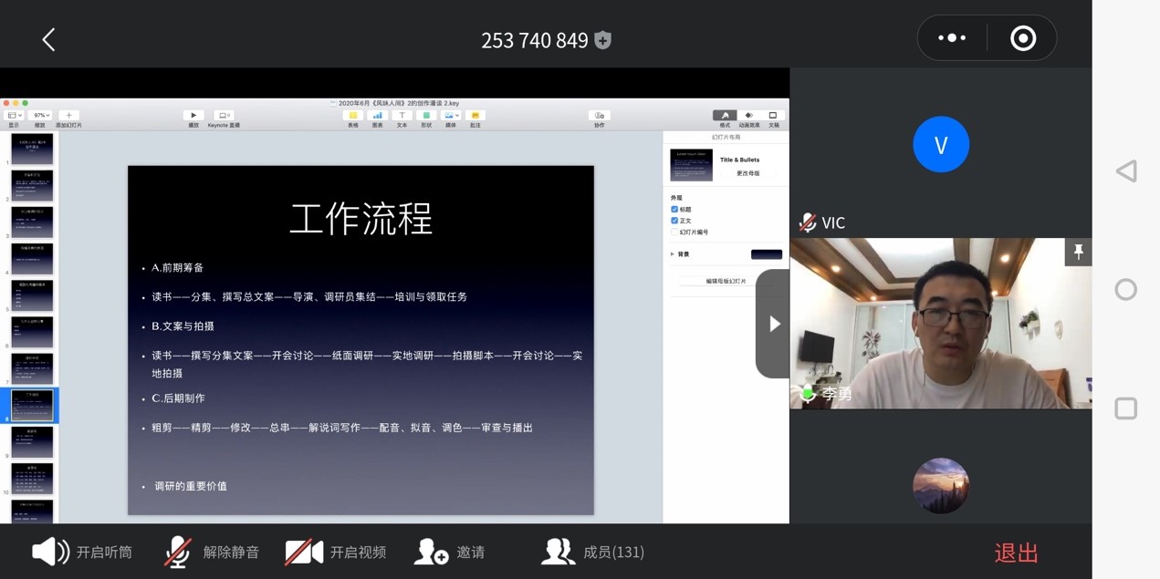 (通讯员:李雅琪)6月23日下午3点,应9428cn太阳集团古天乐邀请,近期热播系列纪录片《风味人间2》总导演李勇通过腾讯会议做客长安学术讲座,为公司师生奉献了一场题为“《风味人间2》创作漫谈”的导演分享会。公司大三年级部分员工、文艺学专业研究生、新闻与传播公司部分员工等一百三十余人进行了线上学习以及导演交流。讲座由李雅琪老师主持,裴亚莉教授做特邀嘉宾。