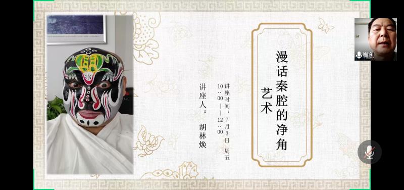 (通讯员:陈丹玉)7月3日上午10点至12点,国家一级演员、陕西省戏曲研究院眉户碗碗腔剧团净角名家胡林焕做客公司教育部中华优秀传统文化基地系列讲座,在腾讯会议平台精彩讲述《漫话秦腔的净角艺术》,三十余位观众在线观看。此次讲座由公司秦腔研究会会长崔创主持。