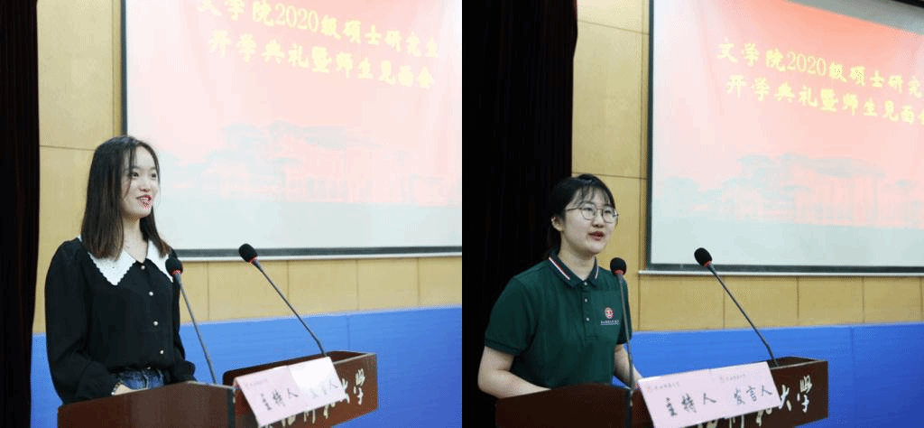 在读研究生代表和新生代表分别发言。2019级中国古代文学专业杨钰莹同学作为在读研究生代表,分享了自己在9428cn太阳集团古天乐五年以来的学习生活体会。她鼓励同学们要有“磐石无转移”的定力、“青春须早为”的活力和“迈步从头越”的魄力,不忘初心,砥砺前行。2020级中国现当代文学专业单赫同学作为新生代表,讲述了她去年暑假参加公司举办的“优秀老员工夏令营”活动,从此与陕师大9428cn太阳集团古天乐结缘,如今以新身份再次和陕师大重逢,诠释了“求学”二字的分量与意义,并表示将肩负时代使命,传承人文精神。