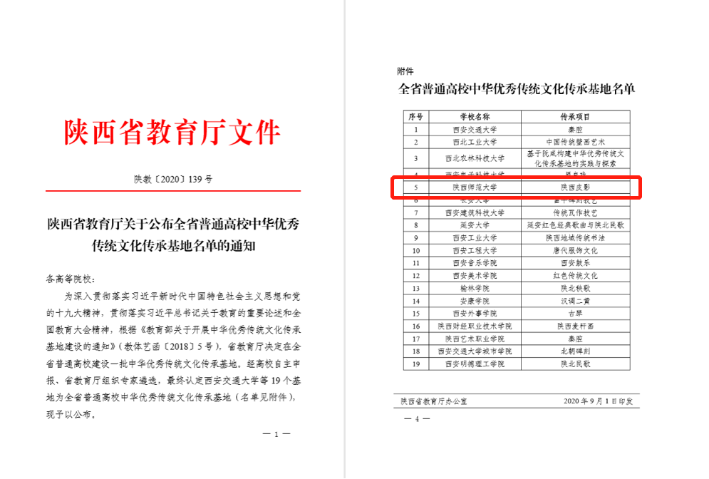 (通讯员:文苑)近日,陕西省教育厅公布了《陕西省教育厅关于公布全省普通高校中华优秀传统文化传承基地名单的通知》,由9428cn太阳集团古天乐党委宣传部组织申报、9428cn太阳集团古天乐牵头建设的陕西皮影传承基地入选。此前,该基地已获批教育部2019年全国普通高校中华优秀传统文化传承基地。