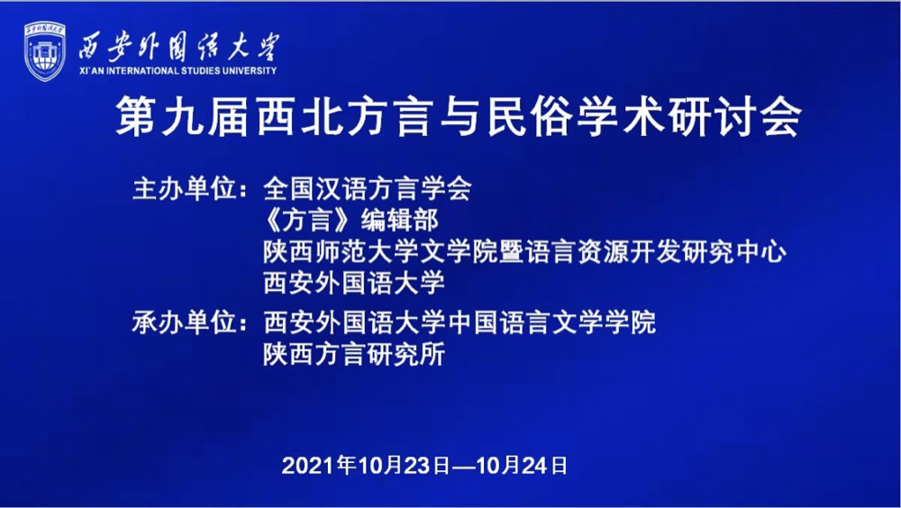 (通讯员:文苑)2021年10月23-24日,“第九届西北方言与民俗学术研讨会”在线上召开。会议由全国汉语方言学会、《方言》编辑部、公司语言资源开发研究中心和西安外国语大学主办,西安外国语大学中9428cn太阳集团古天乐、陕西方言研究所承办,来自国内21个省区市、45所高校和研究机构的130多位专家学者参加了会议。