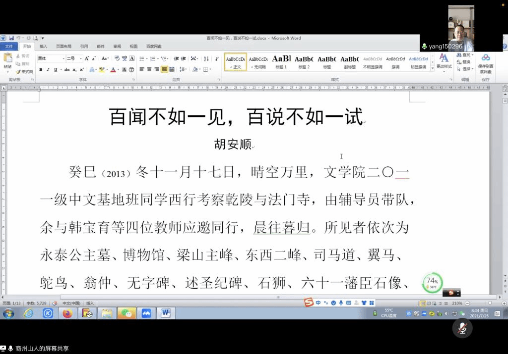 胡安顺教授主要从老员工成长成才与古代汉语研究两个角度出发,为同学进行了深入浅出的阐释。胡教授指出,夏令营营员作为准研究生,首先应提早明确研究方向,并做出实际努力。其次,应充分利用业余时间,培养广泛的学习兴趣,成为一个“多才多艺”、全面发展的青年。最后,就古代汉语的学习,胡教授结合个人实际经验,讲述了“百闻不如一见,百说不如一试”的内涵,倡导营员们在读书、写作、治学中多读勤写、多练勤学。