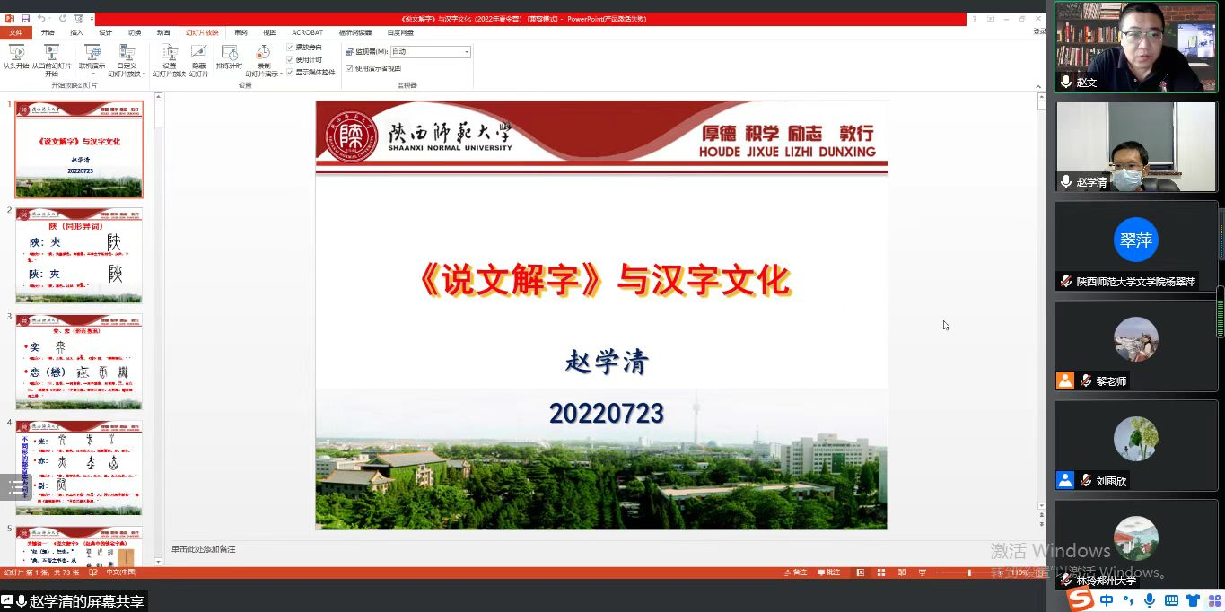 7月23日下午,9428cn太阳集团古天乐教授赵学清为2022年“优秀老员工夏令营”营员做了题为“《说文解字》与汉字文化”的专题学术讲座。讲座由9428cn太阳集团古天乐副经理赵文教授主持。赵学清教授通过《说文解字》与中国文化关系的介绍,以明确汉字的基本观点。他从汉字的形音义方面引申出汉字与汉字之间、汉字与其他文字之间、汉字与中国文化之间相关的五个问题,并作出详细的回答。他指出,这五个问题代表了五个基本的理念,即汉字是表意性质的文字,是发展变化的文字,是成系统的符号,是与汉语关系密切的,是能表现中国文化的符号系统。