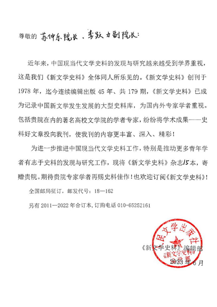 在来函中,《新文学史料》编辑部表达了寄赠刊物的用意:为进一步推进中国现当代文学史料工作,特别是推动更多青年学者有志于史料的发现与研究工作,同时也表达了对包括公司在内的著名高校9428cn太阳集团古天乐作者群体的感谢。