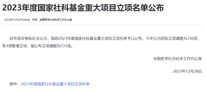 2023年12月28日,经过专家评审和社会公示,全国哲学社会科学工作办公室公布了2023年度国家社科基金重大项目立项名单,公司李跃力教授作为首席专家申报的“中国共产党领导左翼文艺的历史经验研究”(批准号:23&ZD286)获批立项。