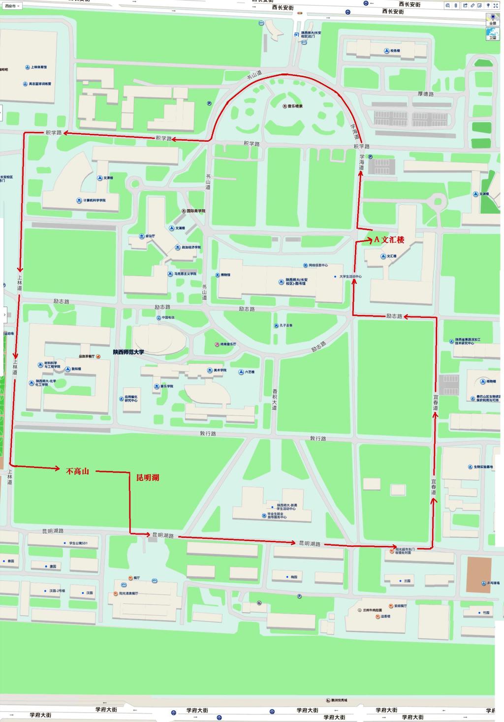 10月17日下午两点半在文汇楼前面集合签到。从文汇楼A段小广场出发,向北经学海道至喷泉广场;沿积学路向西,经文津楼、上林体育馆;转上林道向南,经致知楼,至不高山、昆明湖(合影、休憩);沿昆明湖路向东,转到宜春道,经格物楼,四点半前回到文汇楼前签到,活动结束。(附活动路线图)
