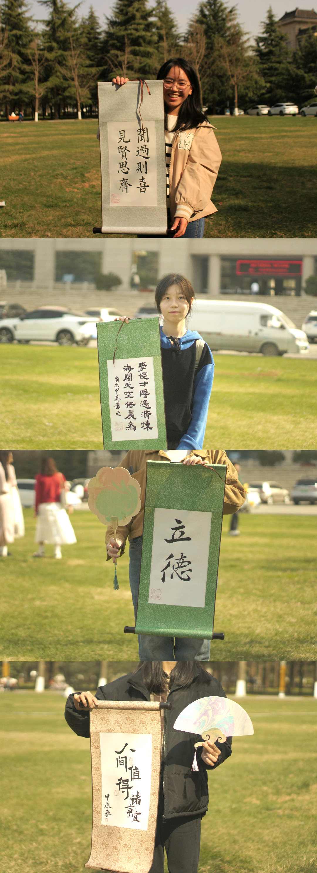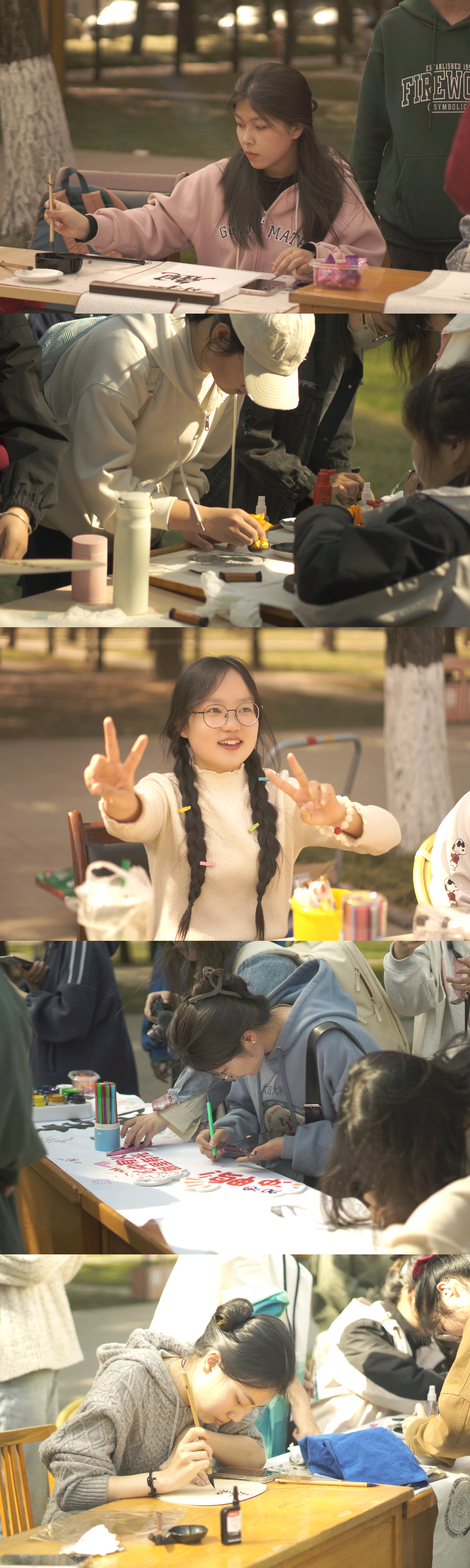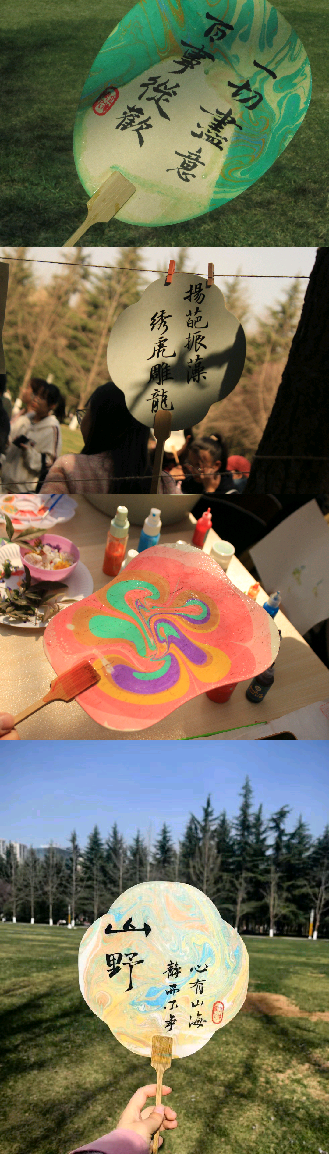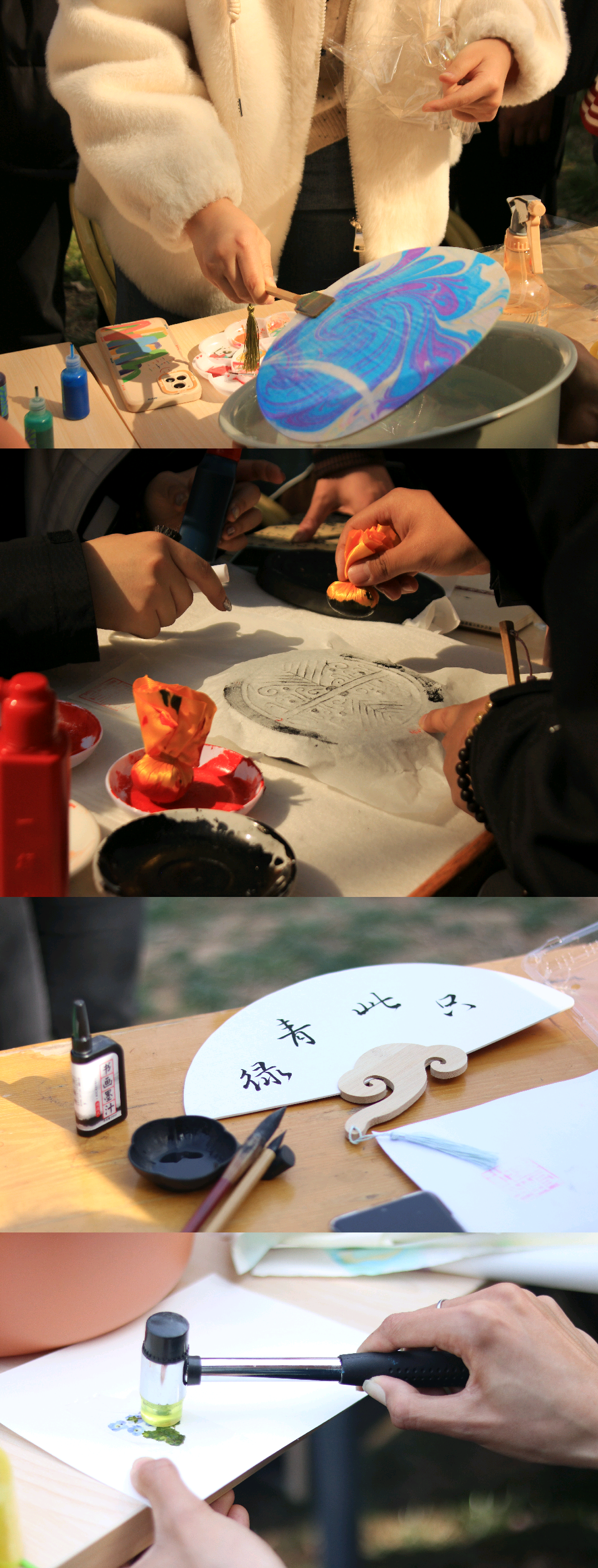 活动现场,同学们执笔,在题字长卷上,画出春天的形状;制作干花吊坠,封存春日的芬芳;在团扇上拓染题字,定格水中绽放的色彩,享受快乐的“多巴胺”。