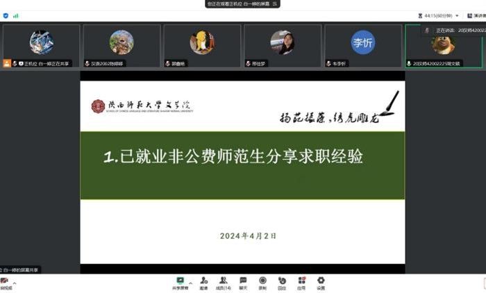 周文硕结合自己应聘国企和地方中学的经历,提出在求职阶段要多平台搜集就业信息,找准就业定位,助力高效高质量就业。陆茜瑜提醒在应聘公司时要关注招聘进度和笔面内容,教案设计可以适时与中学语文四大核心素养产生联结,体现专业水平。高小淑从公务员笔试备考、习题练习和面试准备三方面展开交流,提示在基础课程的学习中要善于利用网络资源,做好备考资料的汇总。